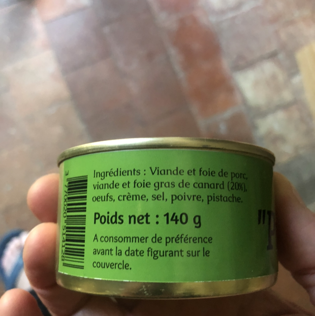 Viande et foie de porc, viande et foie gras de canard, 20%, œuf, crème, sel, poivre, pistaches